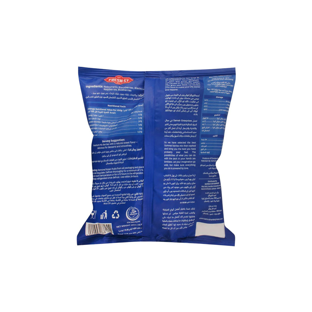 Elevate your recipes with the vibrant medley of Fresh Street Frozen Fruit Of The Forest, 450g. This delightful mix features a colorful blend of redcurrants, blackcurrants, blackberries, raspberries, and blueberries. The berries boast a rich palette of deep reds and purples, adding visual appeal to your dishes while delivering a burst of tangy-sweet taste. Add a splash of forest-fresh goodness to your day with Fresh Street Frozen Fruit Of The Forest.
