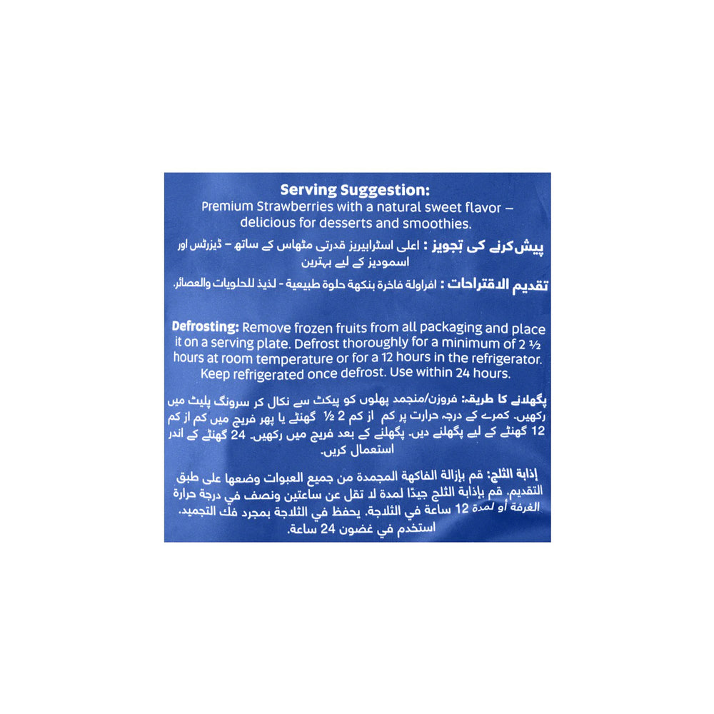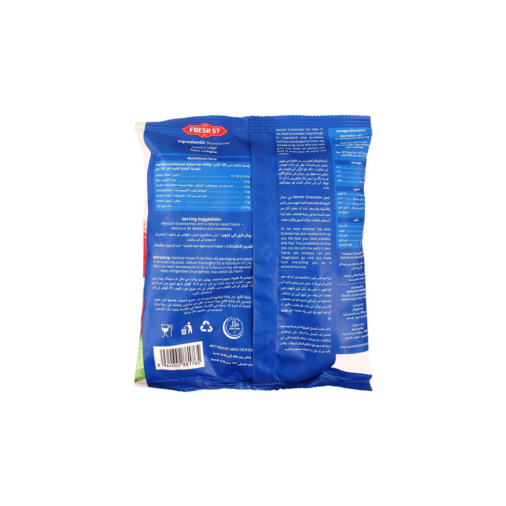 Enjoy the sweet taste of summer all year round with Fresh Street Frozen Strawberries, 450g. These premium strawberries are picked at peak ripeness and flash-frozen to lock in their vibrant color, juicy texture, and natural sweetness. Their deep red hue and plump shape add visual appeal to any dish, while the resealable pouch ensures freshness and convenience. Make every recipe more delicious and nutritious with Fresh Street Frozen Strawberries.